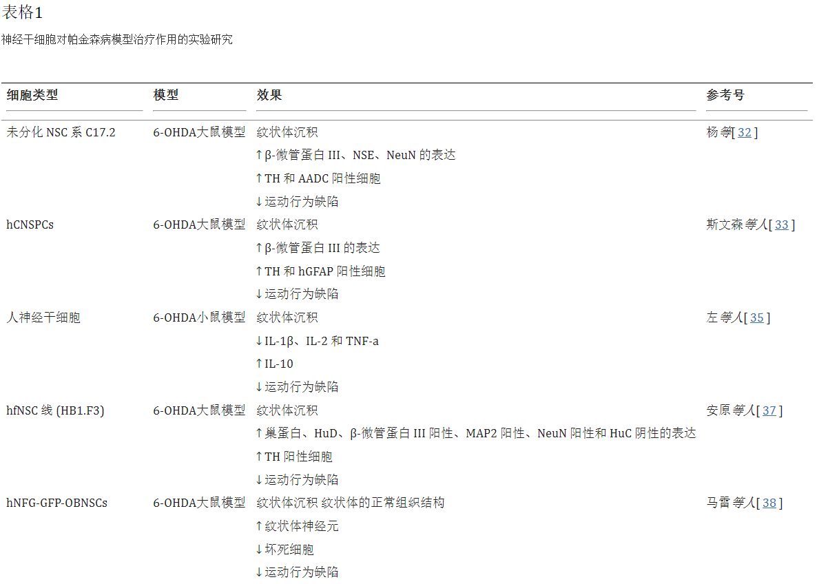 多项临床前研究表明,不同类型的人类神经干细胞移植后,可以在特定的大脑部位迁移、存活和增殖。免疫组织化学检查支持的证据表明移植的人类神经干细胞可以转化为功能性神经元并整合到神经回路中。体内研究已证明神经干细胞移植是治疗帕金森病的有效方法(表格1)。