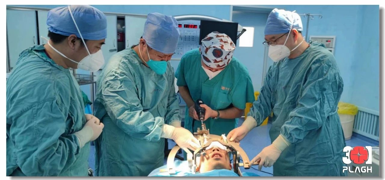 在第六医学中心多科室的通力合作下,手术团队分工协作,孙君昭主任带领董超主治医师给患者固定头架,刘建国主任带领韩晓琛主治医师全程监测患者脑功能状态。手术团队利用核磁扫描定位后,使用立体定向计划系统设计靶点与穿刺路径,将神经干细胞按计划经多通道准确送达多个预定病灶部位,顺利拆除立体定向框架,对穿刺点缝合包扎,手术全程无出血等并发症,总历时3小时。