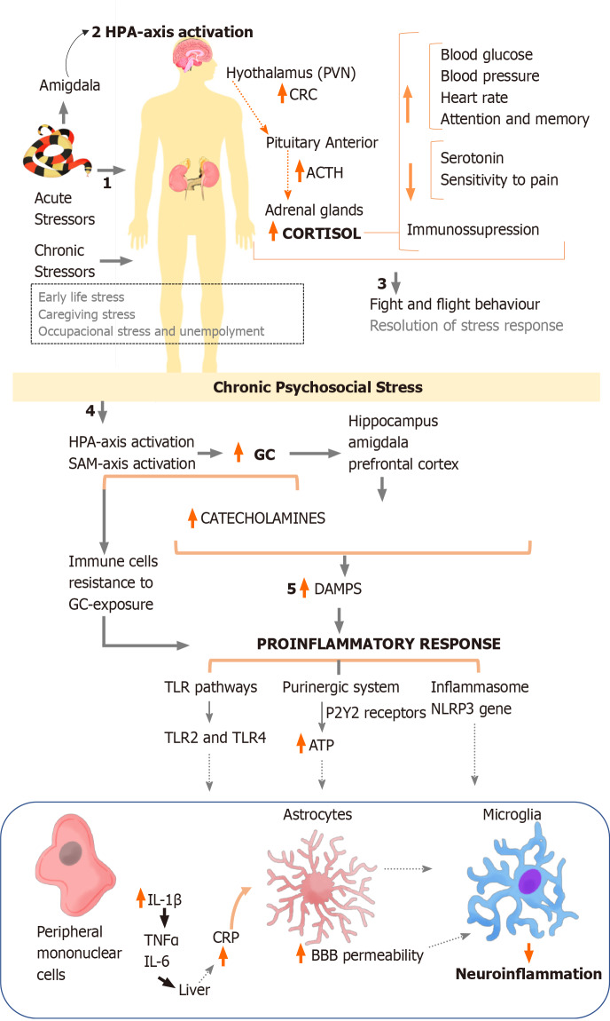 除了引发战斗或逃跑反应外,压力的特征还包括心率、血压、皮质醇和儿茶酚胺的增加。它还激活外周血单核细胞中的炎症通路。然而,当压力暴露持续发生而没有得到解决时,就会触发代谢和生理反应,从而导致慢性炎症状态的形成。图1根据之前的几篇评论,显示了压力和神经炎症在抑郁症发病机制中的关联。