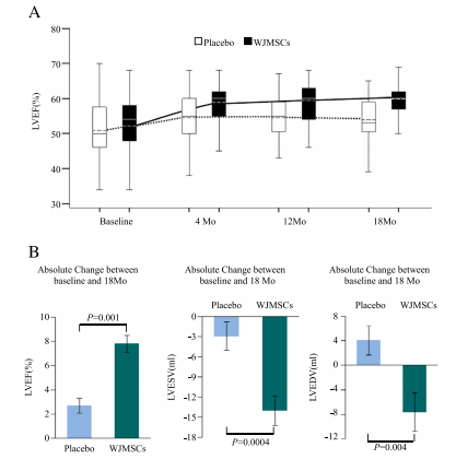 在随访的第3、6和12个月时经胸超声心动图和心脏MRI评估,只有经脐带间充质干细胞治疗组显示出左心室射血分数的显著改善。两组间超声心动图左心室射血分数从基线到第12个月的变化差异显著。