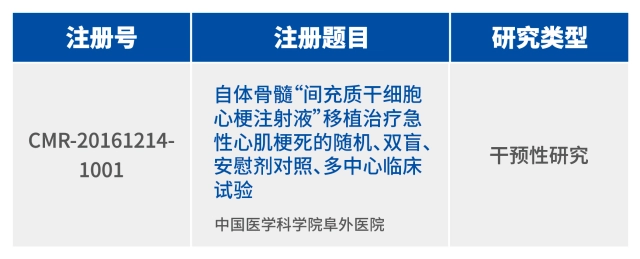 2016年年底,在我国医学研究备案登记信息系统中,干细胞临床研究项目《自体骨髓“间充质干细胞心梗注射液”移植治疗急性心肌梗死的随机、双盲、安慰剂对照、多中心临床试验》获得国家备案,得到了国家干细胞临床研究专家委员会的集体认可。