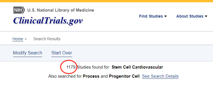 截止2022年12月,在美国国立卫生研究院的最大临床试验注册库clinicaltrials.gov网站上注册的有关干细胞治疗心血管疾病的临床研究项目有1179项。