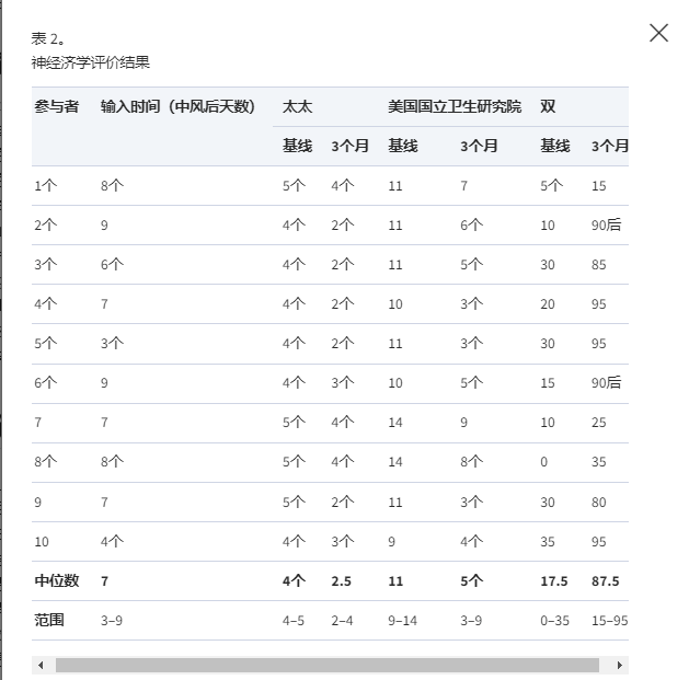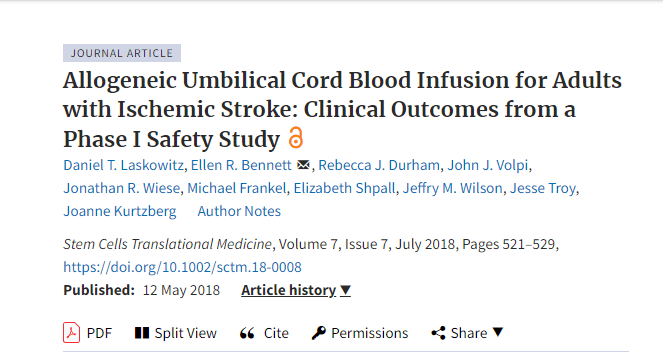 参考资料:Daniel T. Laskowitz, Ellen R. Bennett, Rebecca J. Durham, John J. Volpi, Jonathan R. Wiese, Michael Frankel, Elizabeth Shpall, Jeffry M. Wilson, Jesse Troy, Joanne Kurtzberg, Allogeneic Umbilical Cord Blood Infusion for Adults with Ischemic Stroke: Clinical Outcomes from a Phase I Safety Study, Stem Cells Translational Medicine, Volume 7, Issue 7, July 2018, Pages 521–529, https://doi.org/10.1002/sctm.18-0008