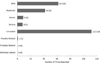 根据严重程度、严重性和与研究治疗的关系分类的AE。共报告了113起。