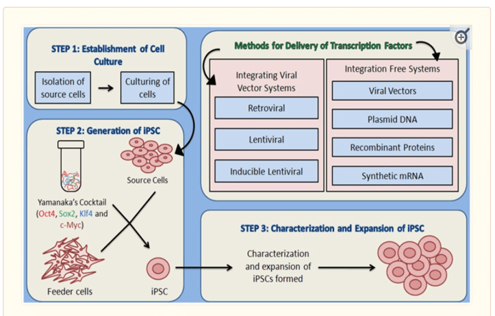 (2) 然后用 Yamanaka 鸡尾酒中的四种因子转染培养的源细胞,并在合适的培养基条件下在为宿主细胞提供营养并负责形成细胞外基质的饲养层上孵育。可以使用两种类型的方法将重编程因子递送到体细胞中——整合病毒载体系统和非整合方法。