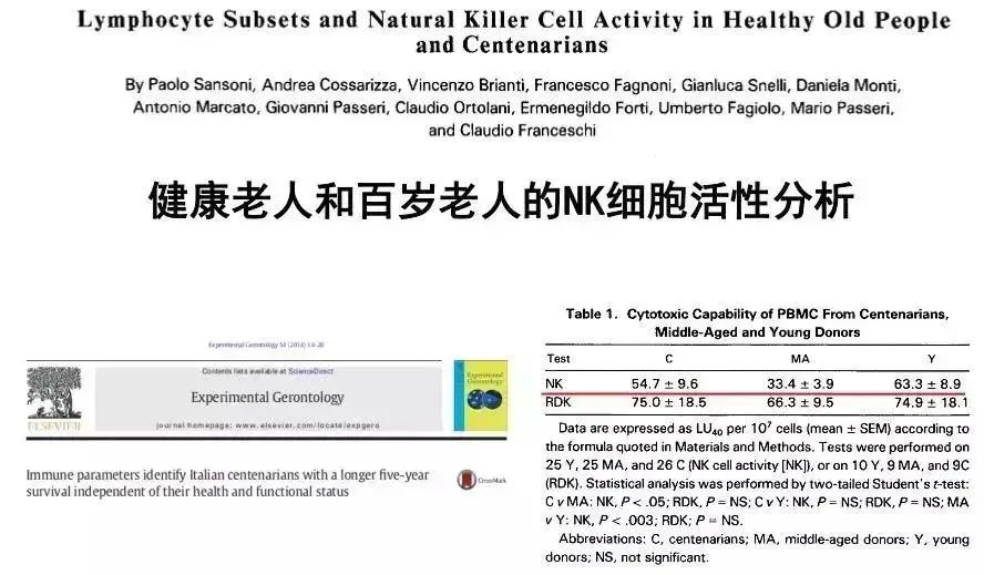 有趣的是,百岁老人体内的NK细胞的杀伤活性仍高达55%,这说明长寿者体内的NK细胞杀伤活性更高。
