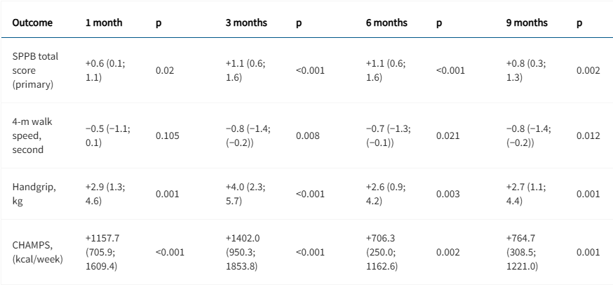 - 显著改善了多项身体机能指标:SPPB评分、步速、握力、体力活动水平、疲劳程度、膝关节症状及总体健康状况