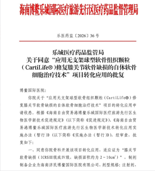 2026年4月24日,博鳌国际医院引进的CartiLife®自体软骨细胞治疗技术获海南乐城医疗药品监管局正式批准,允许在该院开展临床应用。这为中重度膝关节软骨缺损患者提供了一项基于再生医学路径的创新治疗方案。