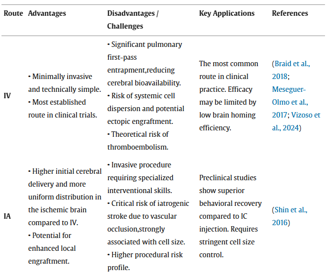 - 静脉输注最为常见,但细胞易滞留于肺毛细血管网,导致脑部归巢数量显著减少,且存在短暂植入、细胞衰老、栓塞及理论上的致瘤风险等障碍。