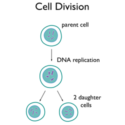 大多数细胞分裂。在分裂前不久,DNA复制,然后细胞分裂成两个子细胞。每个细胞都有原始细胞的 DNA、细胞质和细胞膜的完整副本。