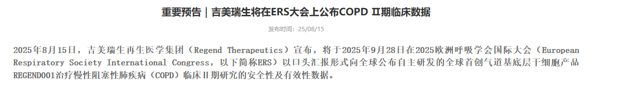 8月15日,上海瑞金落地的慢阻肺干细胞治疗临床实验室吉美瑞生再生医学集团(Regend Therapeutics)正式宣布,将在2025年9月28日于荷兰阿姆斯特丹举办的欧洲呼吸学会国际大会(ERS)上,以口头汇报形式向全球披露其自主研发的全球首创气道基底层干细胞产品REGEND001,在治疗慢性阻塞性肺疾病(COPD)临床Ⅱ期研究中的安全性与有效性核心数据,为全球慢阻肺病治疗领域带来新的关注焦点。[9]