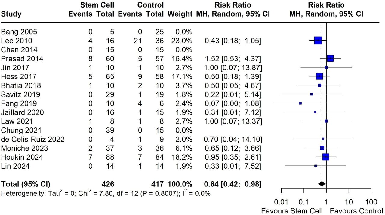 在安全性评估方面,结果显示出积极信号。死亡率数据显示,干细胞治疗组的死亡风险显著低于对照组(图3),相对危险度为0.64(95%CI 0.42至0.98, p=0.040),且各研究间无异质性(I²=0%)。