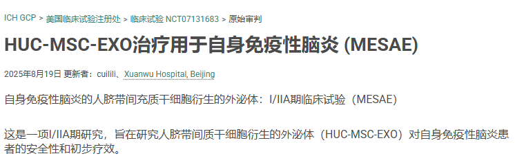 尽管临床前数据令人鼓舞,外泌体疗法在风湿病领域的临床试验尚处于早期探索阶段。目前,一项I/IIA期研究(MESAE,NCT07131683)正在评估人脐带MSC来源外泌体(HUC-MSC-EXO)在自身免疫性脑炎患者中的安全性和初步疗效,采用鼻内给药方案,包含三个剂量队列的剂量爬坡阶段和一个随机双盲安慰剂对照的扩展阶段[6]。