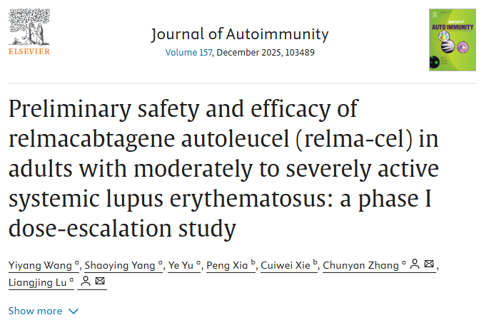 在SLE领域,2025年12月,另一项I期剂量递增研究(NCT06551142)评估了relmacabtagene autoleucel(relma-cel)——一种CD19 CAR-T细胞产品——在中重度活动性SLE中的安全性和有效性。8例女性患者在接受氟达拉滨和环磷酰胺预处理后接受了单次CAR-T细胞输注(剂量范围为50×10⁶至100×10⁶)[5]。
