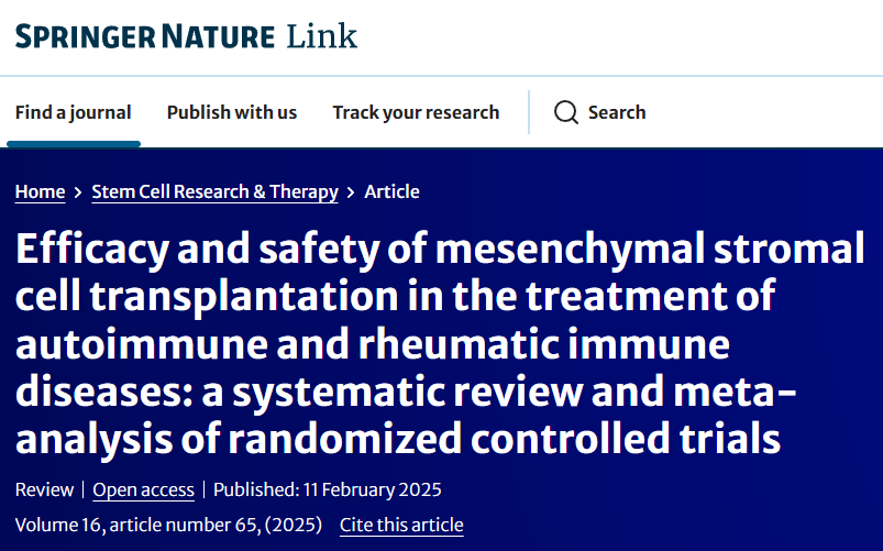 [2]:Zeng, L., Liu, C., Wu, Y. et al. Efficacy and safety of mesenchymal stromal cell transplantation in the treatment of autoimmune and rheumatic immune diseases: a systematic review and meta-analysis of randomized controlled trials. Stem Cell Res Ther 16, 65 (2025). https://doi.org/10.1186/s13287-025-04184-x