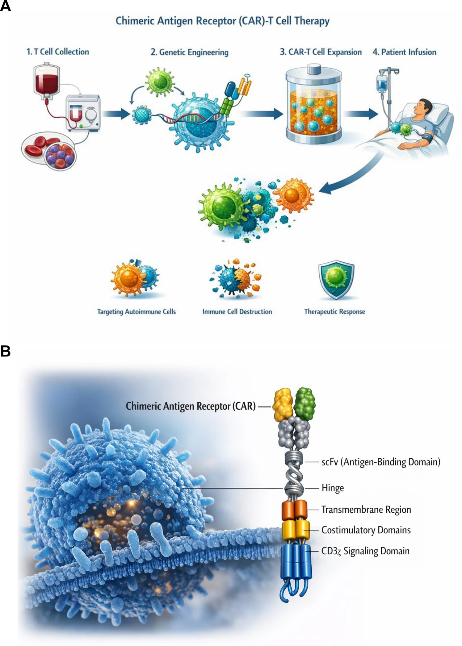 CAR-T细胞疗法是免疫疗法的前沿技术,最初用于血液肿瘤,现正被探索作为自身免疫性疾病的一种变革性手段。其核心是对患者自身的T细胞进行基因工程改造,使其表达嵌合抗原受体(CAR),从而识别并清除驱动疾病病理的自身反应性B细胞或T细胞(图1)。