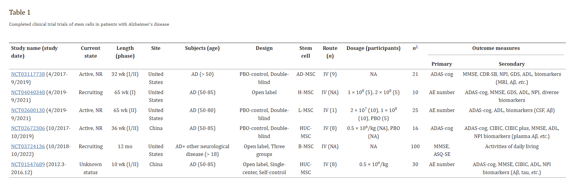 Aβ:淀粉样蛋白-β;AD:阿尔茨海默病引起的痴呆症;ADAS-Cog:阿尔茨海默病评估量表-认知分量表;AE:不良事件;NPI:神经精神病学量表;CSF:脑脊液;AD-MSC:自体脂肪组织来源的间充质干细胞;H-MSC:人间充质干细胞;L-MSC:白血病间充质干细胞;B-MSC:骨髓间充质干细胞;HUC-MSC:人脐带血间充质干细胞;ADL:日常生活活动;NA:不可用;CDR-SB:临床痴呆评定量表的总和;GDS:老年抑郁量表;MMSE:最低精神状态检查;CIDIC:Composite International Diagnostic Interview Core;PBO:安慰剂;IV:静脉内;ASQ-SE:年龄和阶段问卷-社会-情感。