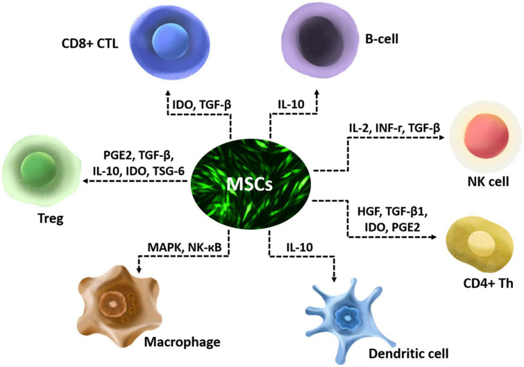 间充质干细胞的抗炎作用主要是通过分泌各种酶和可溶性因子及其对T淋巴细胞的旁分泌作用来实现的,包括幼稚CD4+T细胞、Th1细胞、Th2细胞、Th17细胞、CD4+FoxP3+调节性T细胞细胞 (Treg) 和CD8+T细胞。它们还具有多种抗炎作用,包括影响B细胞的趋化特性、抑制白细胞介素2 (IL-2) 诱导的自然杀伤 (NK) 细胞活化,下调 NK激活受体,并影响骨髓细胞的功能,如单核细胞、树突状细胞和巨噬细胞(图1)。
