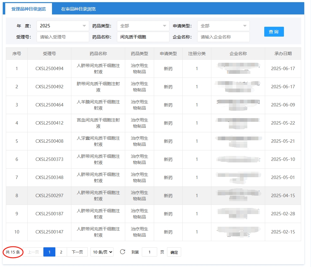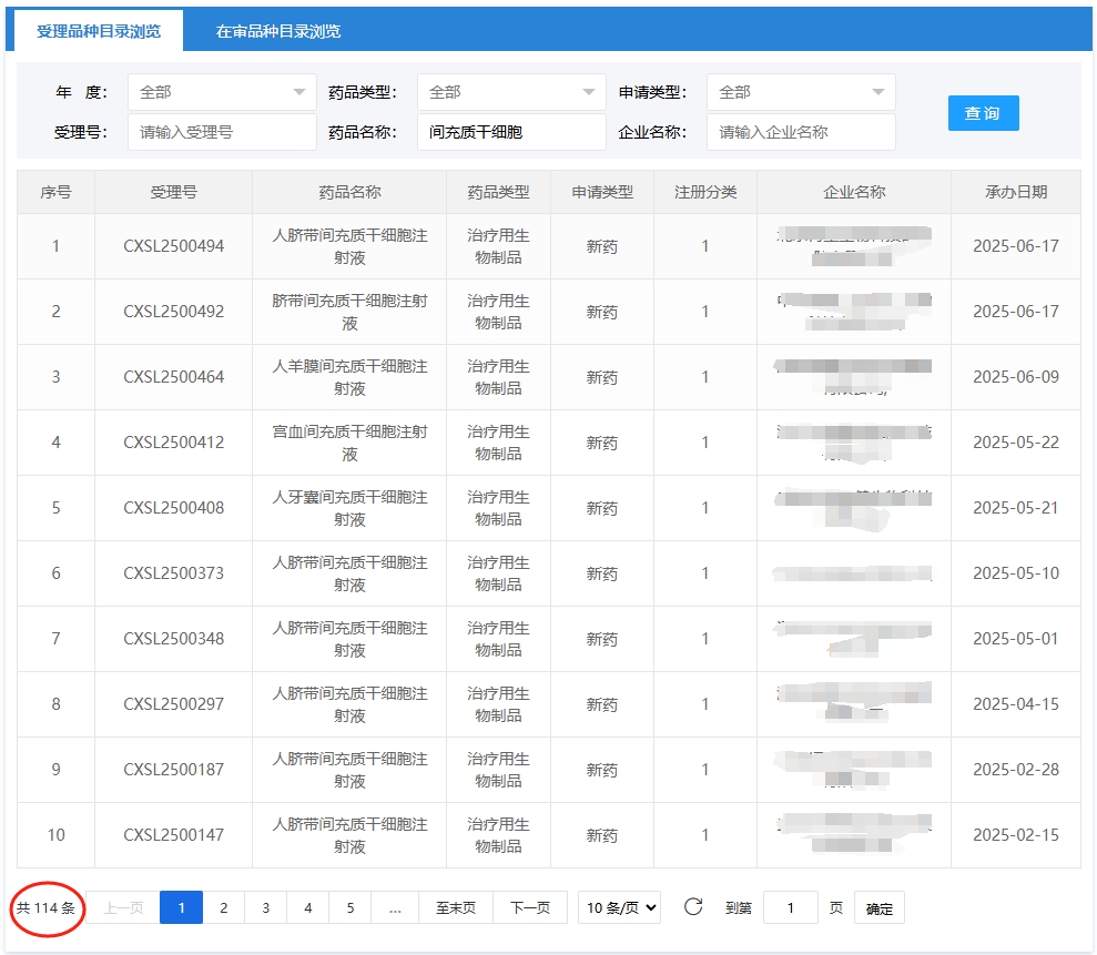 截至2025年1月15日,我们通过在国家药品监督管理局药品审评中心-信息公开-受理品种信息栏目通过关键词“间充质干细胞”搜索查询受理的间充质干细胞新药有114项,其中25年1-5月新增12项。