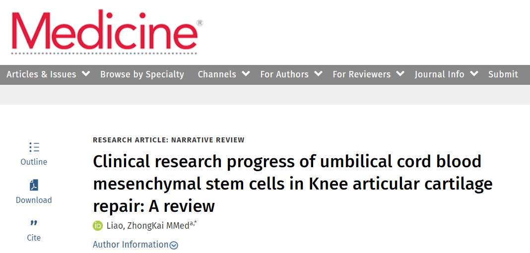 参考资料:廖钟凯MMed a,* .脐血间充质干细胞修复膝关节软骨的临床研究进展。医学104(6):p e41402,2025年2月7日。数字编号:10.1097/MD.0000000000041402