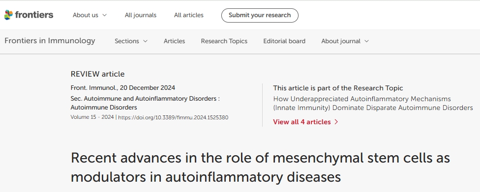主要参考资料:[1]Chen B, Chen Z, He M, Zhang L, Yang L and Wei L (2024) Recent advances in the role of mesenchymal stem cells as modulators in autoinflammatory diseases. Front. Immunol. 15:1525380. doi: 10.3389/fimmu.2024.1525380