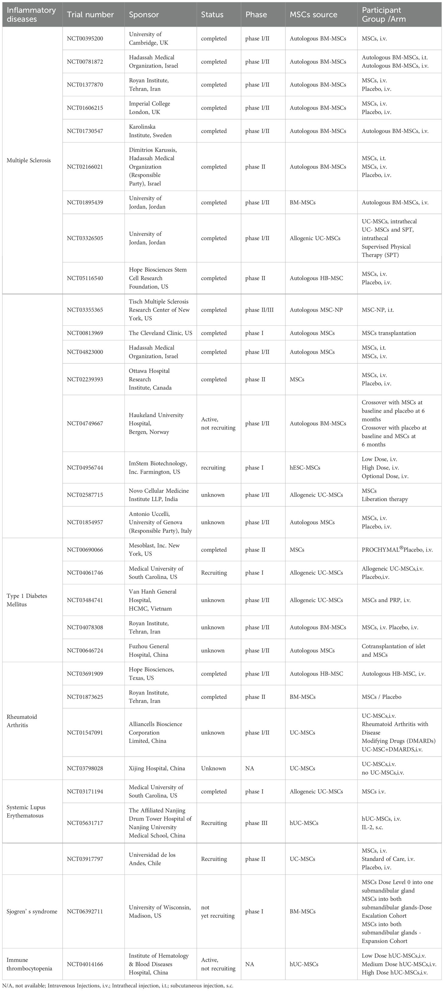我们在表1中总结了MSCs在治疗自身免疫性疾病方面已完成和正在进行的临床试验。这些注册研究的结果均证明了MSCs在治疗自身免疫性疾病方面的安全性和有效性。