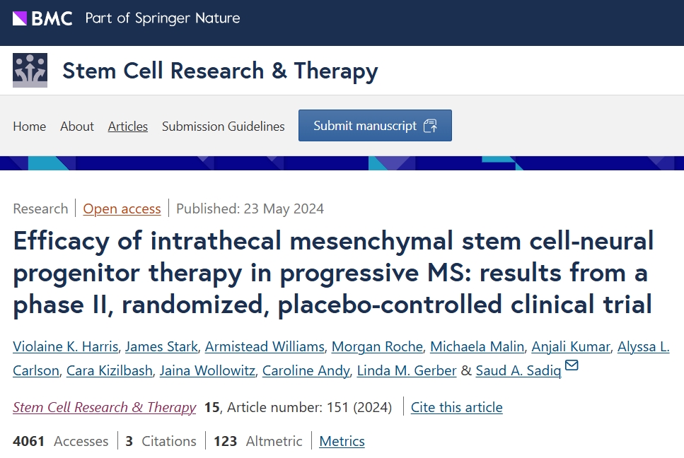 2024年,国际期刊杂志《干细胞研究与治疗》发表了一篇“鞘内间充质干细胞-神经祖细胞治疗进展型多发性硬化症的疗效:II期随机安慰剂对照临床试验结”的文章。