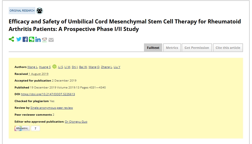 治疗期间,患者在输注100mL生理盐水后立即通过静脉注,40mLUC-MSC悬浮产品(2×10^7细胞/20mL)。使用血清学标志物测试来评估安全性,使用28关节疾病活动评分 (DAS28) 和健康评估问卷 (HAQ) 来评估UC-MSCs治疗RA的长期效果和安全性。研究结果发表在《Dove Press》。