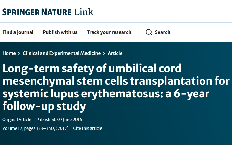 2016年,国际期刊杂志《临床与实验医学》发表了一篇“脐带间充质干细胞移植治疗系统性红斑狼疮的长期安全性:6年随访研究”的文章。