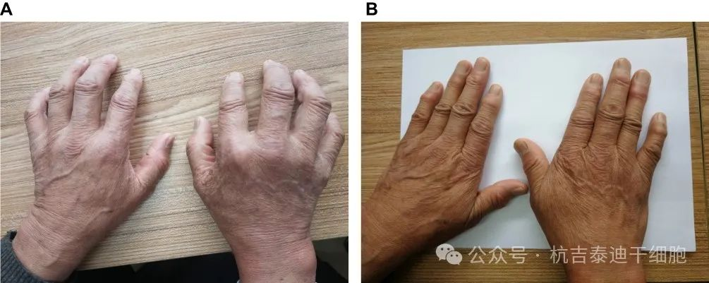 第一位患者是一位68岁的男性,治疗前关节疼痛、肿胀、变形严重,接受UC-MSC治疗6个月后症状得到缓解,并维持至治疗后3年(图1A)。接受UC-MSC治疗3年后,关节变形得到恢复(图1B),疼痛也消失了,并且能够自由活动和进行一些体育锻炼。