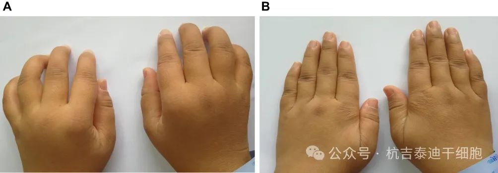 另一名33岁女性类风湿性关节炎患者,治疗前关节肿胀及畸形较为严重(图2A),治疗后病情也获得缓解。接受UC-MSC治疗三年后,其关节畸形得到改善(图2B),肿胀也得到较好的缓解。此外,她现在有时可以自由奔跑和进行一些体育锻炼。