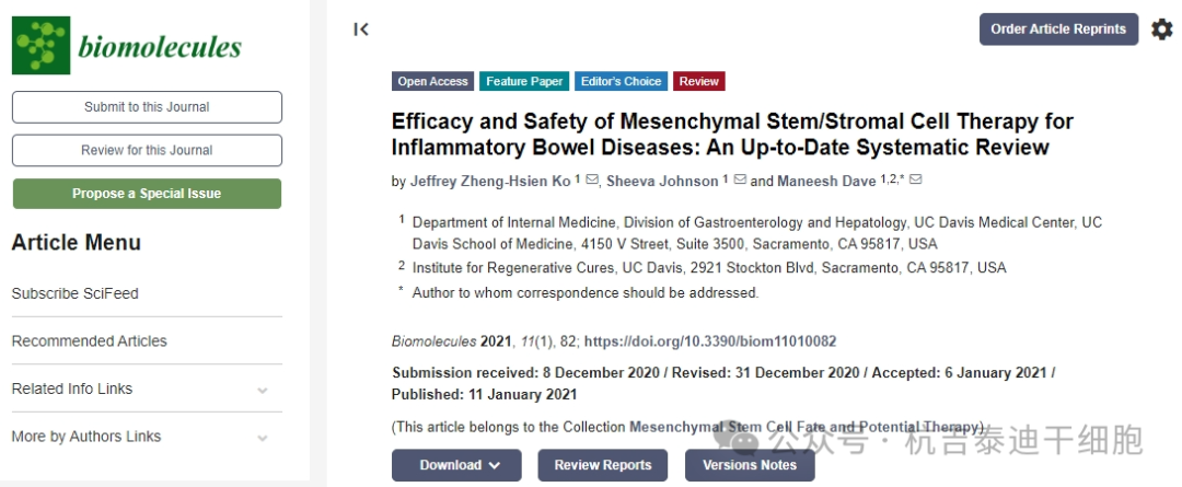 炎症性肠病(IBD):2021年,期刊杂志《Biomolecules》生物分子发表了一篇间充质干细胞/基质细胞治疗炎症性肠病的疗效和安全性:最新系统评价的文章,该综述旨在介绍有关MSC疗法在IBD中的安全性和有效性的最新研究。