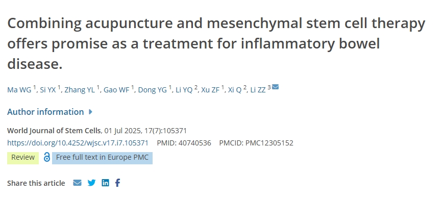 [1]:Ma WG, Si YX, Zhang YL, et al. Combining acupuncture and mesenchymal stem cell therapy offers promise as a treatment for inflammatory bowel disease. World Journal of Stem Cells. 2025 Jul;17(7):105371. DOI: 10.4252/wjsc.v17.i7.105371. PMID: 40740536; PMCID: PMC12305152.