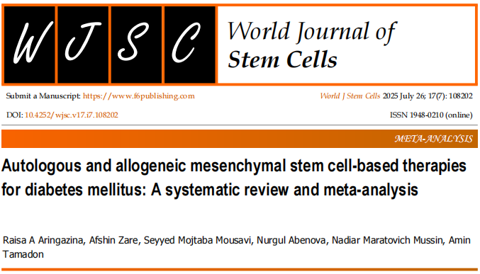 [1]:Aringazina RA, Zare A, Mousavi SM, Abenova N, Mussin NM, Tamadon A. Autologous and allogeneic mesenchymal stem cell-based therapies for diabetes mellitus: A systematic review and meta-analysis. World J Stem Cells 2025