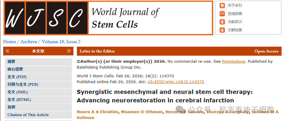 在此困局中,Yang等人[1]发表于《世界干细胞杂志》的最新临床研究,以其开创性的设计,为神经修复领域投下了一束耀眼的光芒。该团队首次在急性脑梗死患者中探索了间充质干细胞(MSCs)与神经干细胞(NSCs)联合移植的疗效,其结果不仅令人鼓舞,更揭示了协同疗法的深层逻辑。本研究基于此重要突破,以三个核心问题为纲,对其科学内涵、临床证据与未来路径进行系统阐述。