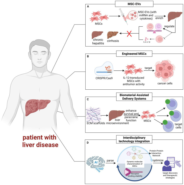 第二,结合基因编辑与生物材料工程的细胞功能强化与递送系统优化策略:利用CRISPR/Cas9等工具对MSCs进行预编辑(如敲除Smad7或导入IL-12),可从源头增强其免疫调节或抗肿瘤功能;诱导多能干细胞来源的MSCs则为标准化、规模化生产提供了可复制的细胞平台。与此同时,生物材料工程(如脱细胞ECM水凝胶、MSCs球体培养)通过模拟肝脏微环境,显著提升工程化MSCs及其分泌的SpEVs在体内的存活率、滞留时间与生物学功能。