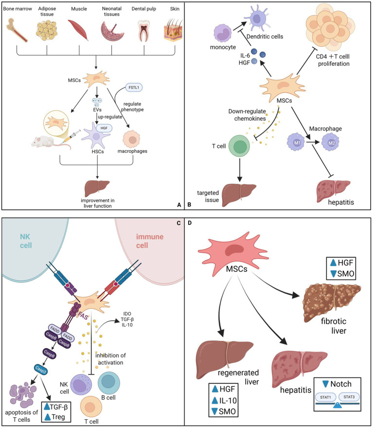 MSCs通过直接干预纤维化级联反应,实现对活化肝星状细胞(HSCs)的抑制作用。MSCs及其细胞外囊泡可下调α-SMA、Col1α1及波形蛋白的表达,促使活化的HSCs恢复静止状态,这一作用通过旁分泌FSTL1、HGF等因子进一步增强。