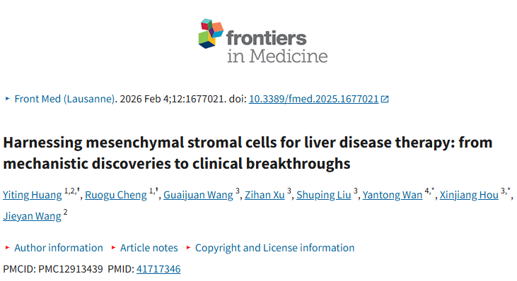[1]:Huang Y, Cheng R, Wang G, Xu Z, Liu S, Wan Y, Hou X, Wang J. Harnessing mesenchymal stromal cells for liver disease therapy: from mechanistic discoveries to clinical breakthroughs. Front Med (Lausanne). 2026 Feb 4;12:1677021. doi: 10.3389/fmed.2025.1677021. PMID: 41717346; PMCID: PMC12913439.