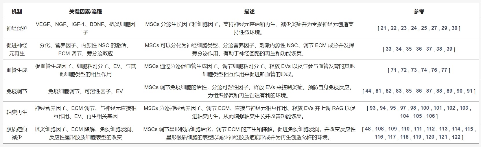 MSC分泌多种具有神经保护作用的生长因子和细胞因子,在支持SCI后受损神经元的恢复中发挥关键作用。