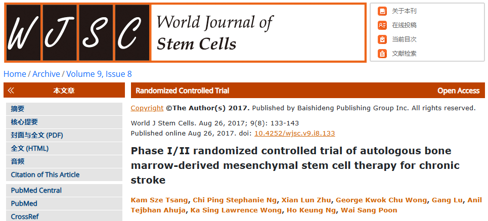2017年,Tsang等的自体骨髓间充质干细胞疗法治疗慢性卒中的I/II期随机对照试验显示,自体骨髓MSC移植相比安慰剂改善了神经功能恢复。