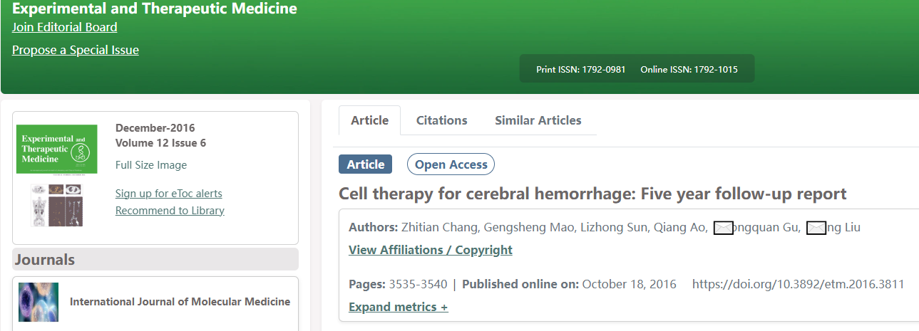 2016年,Chang等通过一项“细胞疗法治疗脑出血:五年随访报告”研究发现,在患有中重度ICH后遗症(超过60个月)的患者中,骨髓或脐带MSC移植的功能恢复优于单独的手术血肿清除。