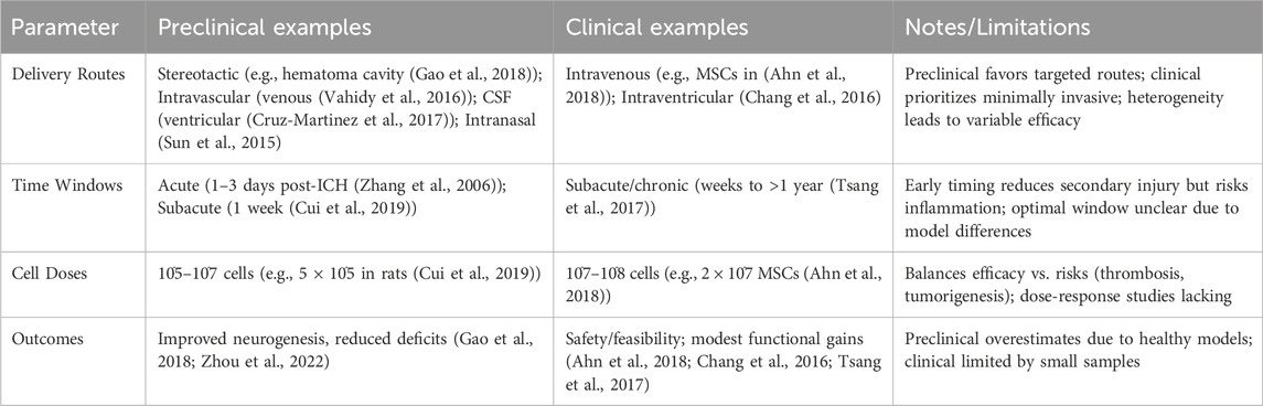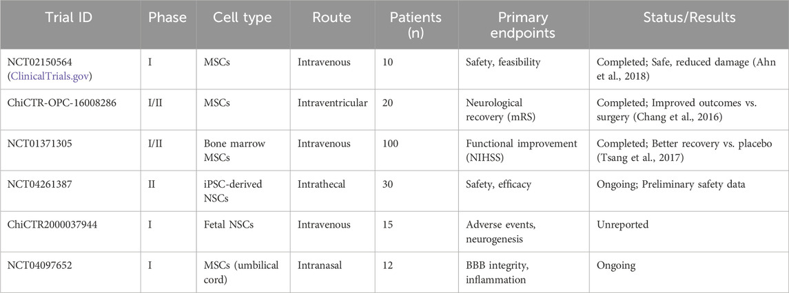 此外,临床探索已开始,例如血肿清除术联合神经干细胞移植已显示出协同增效的潜力。尽管临床前研究的成功推动了临床试验的扩展——主要针对缺血性卒中——但仍需开展更多试验来证实NSCs在脑出血(ICH)中的疗效。