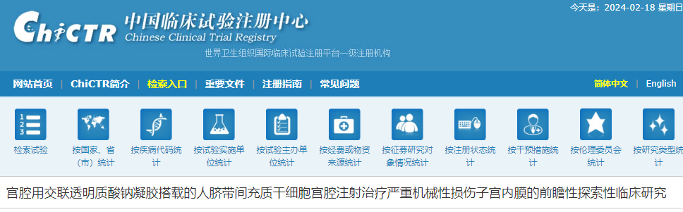据悉,该项研究注册号为ChiCTR2400080588,注册日期为2024年2月1日,旨在评估宫腔用交联透明质酸钠凝胶搭载的人脐带间充质干细胞宫腔移植治疗对中重度宫腔粘连及薄型内膜患者的有效性和安全性。