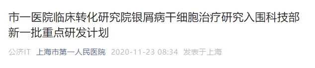 此外,2020年11月23号,科技部公布了新一批重点研发计划。其中,由上海市第一人民医院临床转化研究院王宏林教授任首席科学家,中南大学湘雅医院、厦门大学和湖南光琇高新生命科技有限公司共同参与的“间充质干细胞治疗银屑病及银屑病型关节炎的临床研究”项目入围“干细胞及转化研究专项名单”,这也是上海市一医院连续第二年获得该重大专项。