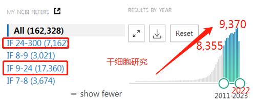 到2022年11月23日,干细胞研究领域已经发表了42万篇PubMed收录的论文,其中近10年就发表了23万篇。干细胞研究成果15.1%发表在9分+期刊,4.4%发表在24分以上期刊。
