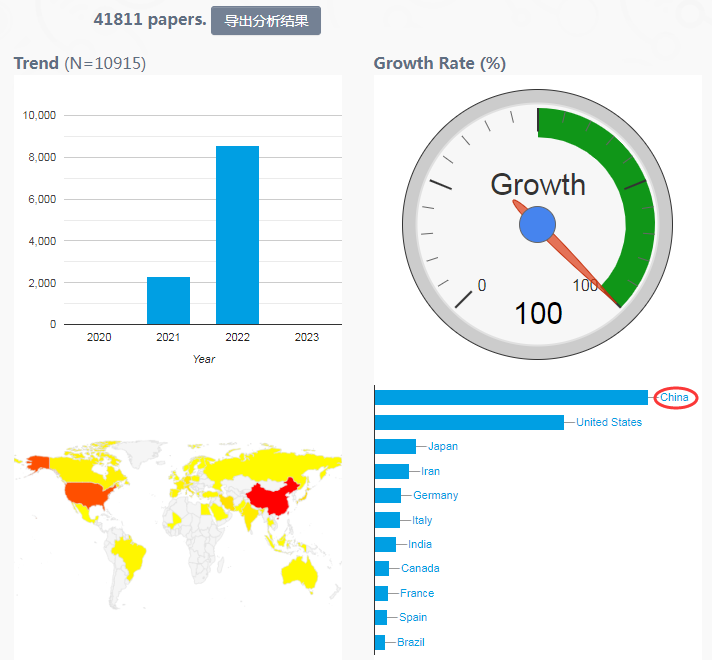 国家分布可以看到,中国发表的研究论文数量为3,727篇,占34.1%,居第一位。