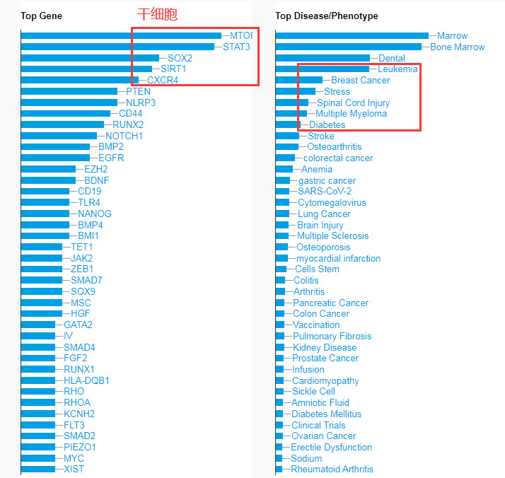 如下图所示, 白血病、乳腺癌、脊髓损伤、多发性骨髓瘤、糖尿病等是干细胞研究中最关注的疾病。其他疾病还包括中风、骨关节炎、大肠癌、贫血、胃癌、SARS-CoV-2、肺癌、脑损伤、多发性硬化症、骨质疏松症等。