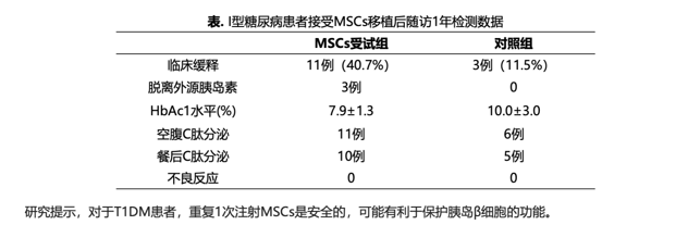 2021年,南京市鼓楼医院内分泌科朱大龙教授团队在《脐带间充质干细胞治疗中国成人Ⅰ型糖尿病重复移植:一项开放、非随机、平行对照临床试验》这项研究中,治疗组和对照组的改善数据如下: