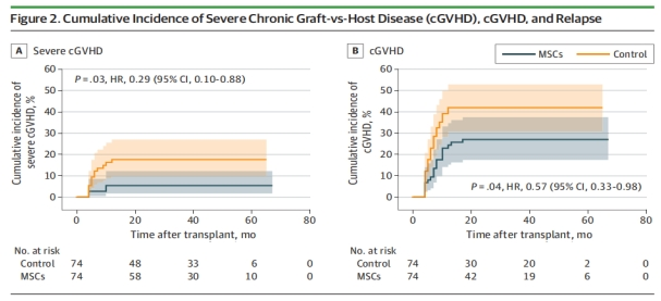 MSCs组cGVHD预估2年累积发病率15.8%(95%CI,8.6%-26.6%),对照组26.2%(95%CI,16.8%-37.9%),HR为0.57(95%CI,0.33-0.98,图2B)。