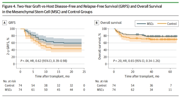3.无复发生存率(GRFS):MSCs组预估2年GRFS为59.5%(95% CI,48.1%-69.9%),对照组为26.2%(95% CI,17.6%- 37.2%),HR为0.62(95 % CI,0.39-0.98,图4A)。尽管两之间没有显著差异,但MSCs组患者的OS曲线有潜在改善(图4B)。此外,MSCs组没有出现cGVHD相关死亡病例,而对照组有5例患者死于cGVHD相关并发症。此外,MSCs组中有严重出血性膀胱炎的患者症状得到明显改善。